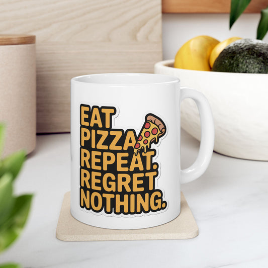 Eat Pizza. Repeat. Regret Nothing. – Bold Cravings Quote Mug