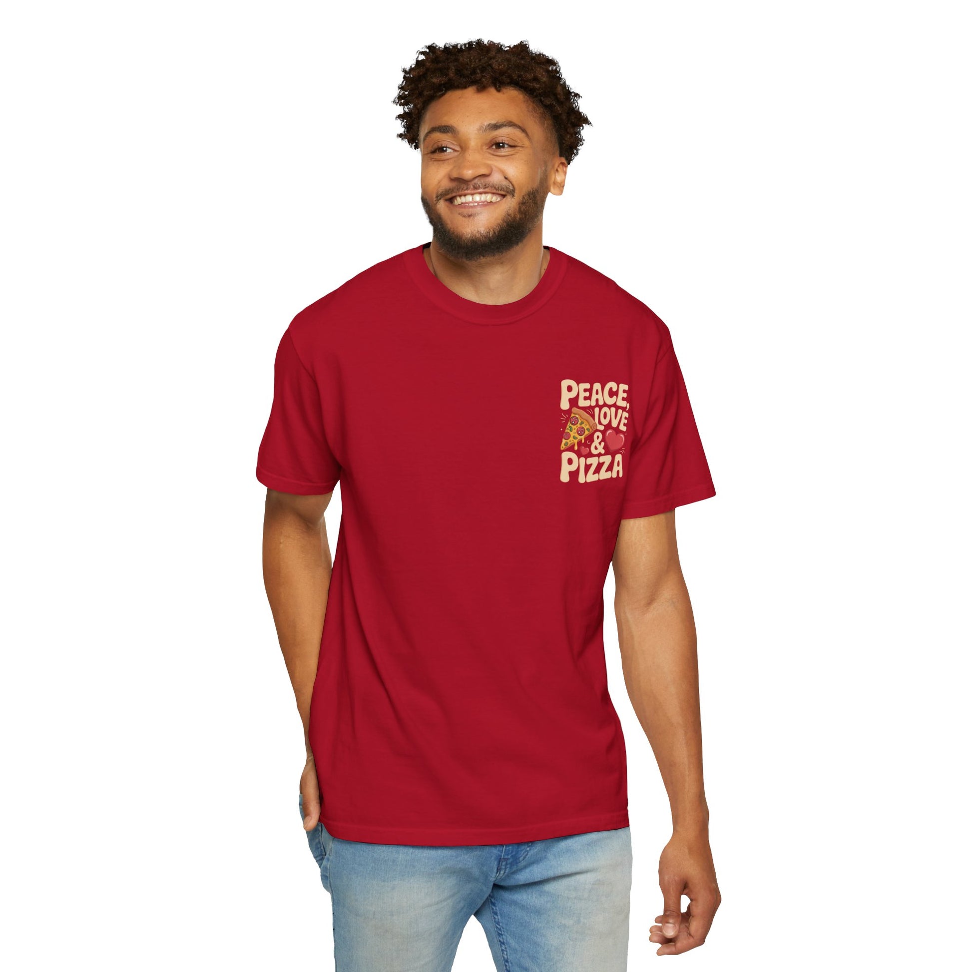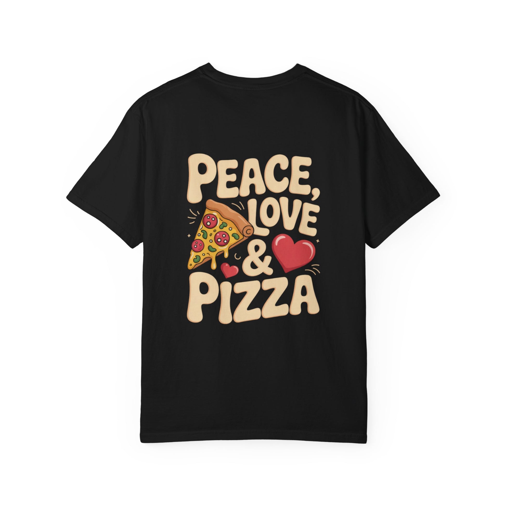 Peace, Love & Pizza Unisex Garment-Dyed T-shirt - Fun Casual Tee for Pizza Lovers, Perfect for Gifts, Parties, and Everyday Wear